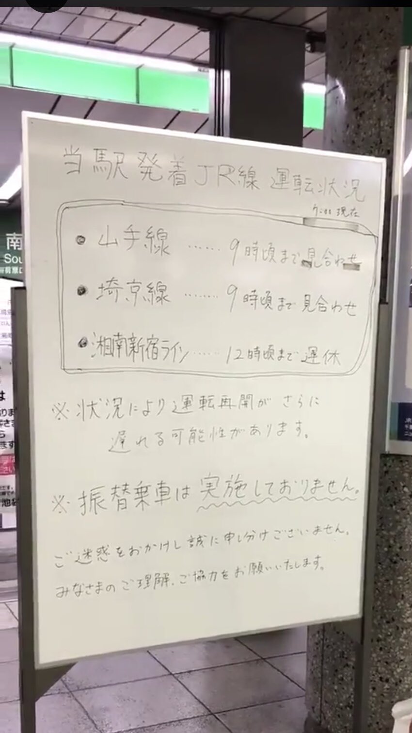 ひがくぼきみお On Twitter 池袋駅の掲示板に運転状況が書いてある 山手線 9時頃まで見合わせ 埼京線 9時頃まで見合わせ 湘南新宿ライン 12時頃まで運休 状況により運転再開がさらに遅れる可能性があります 振替乗車は実施しておりません